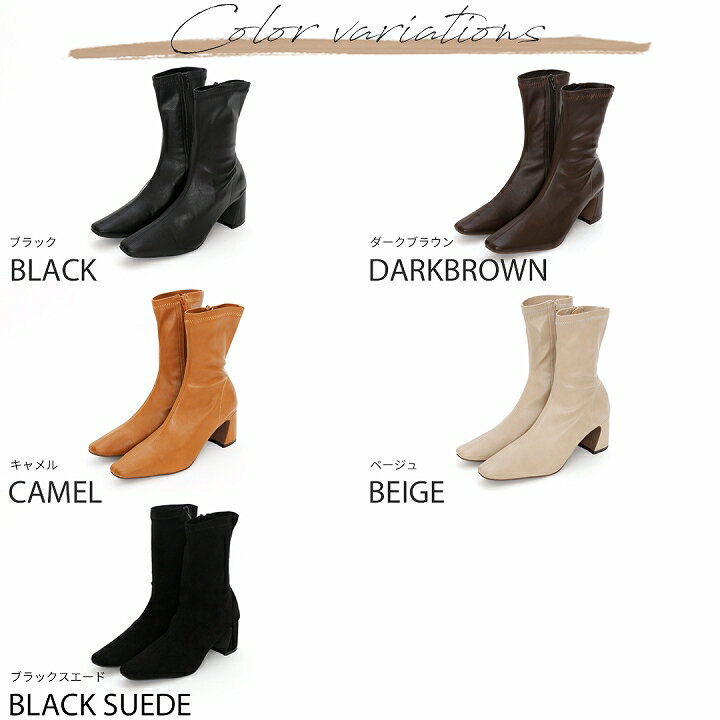 ・サイドファスナー付きで脱ぎ履きラクチン ・太ヒールで安定感があって履きやすい 素 材 ストレッチ素材 カラー BL(ブラック) DBR(ダークブラウン) BG(ベージュ) CM(キャメル) BLS(ブラックスエード) 生産国 中国 FITTING COMMENT 着用サイズ M 着用フットウェア ストッキング ワイズ ぴったり 着用感 ぴったり コメント ストレッチ素材がとても柔らかいので足当たりが良く履きやすいです。