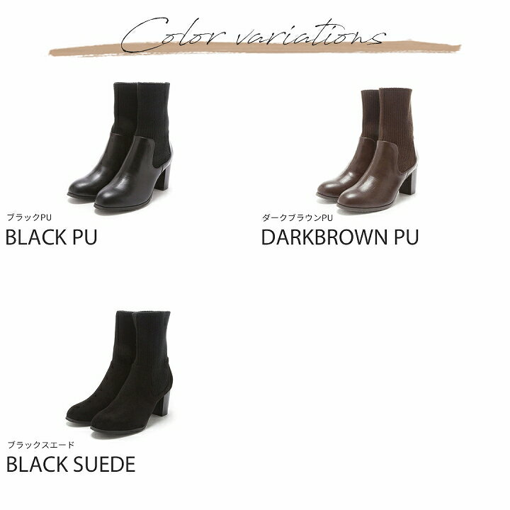 ・履き口のリブニットは柔らかく伸縮性があるので脱ぎ履きしやすい ・かかと高反発クッションでしっかりサポート 素 材 合成皮革(xxPU) スエード素材(××S) リブニット カラー BLPU(ブラックPU) BLS(ブラックスエード) DBRPU(ダークブラウンPU) 生産国 中国 FITTING COMMENT 着用サイズ M 着用フットウェア 薄めの靴下 ワイズ ぴったり 着用感 ぴったり コメント 安定感のある太めのヒールで軽量なので履きやすいです。