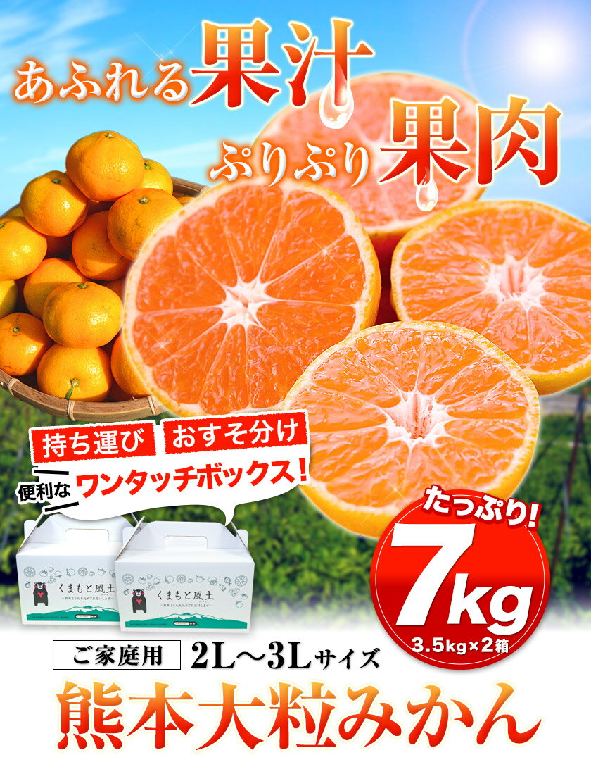 名称 みかん 産地 熊本県産 内容量 みかん約7kg(3.5kg×2箱)【2L〜3Lサイズ】 賞味期限 生ものですのでなるべくお早めにお召し上がりください。